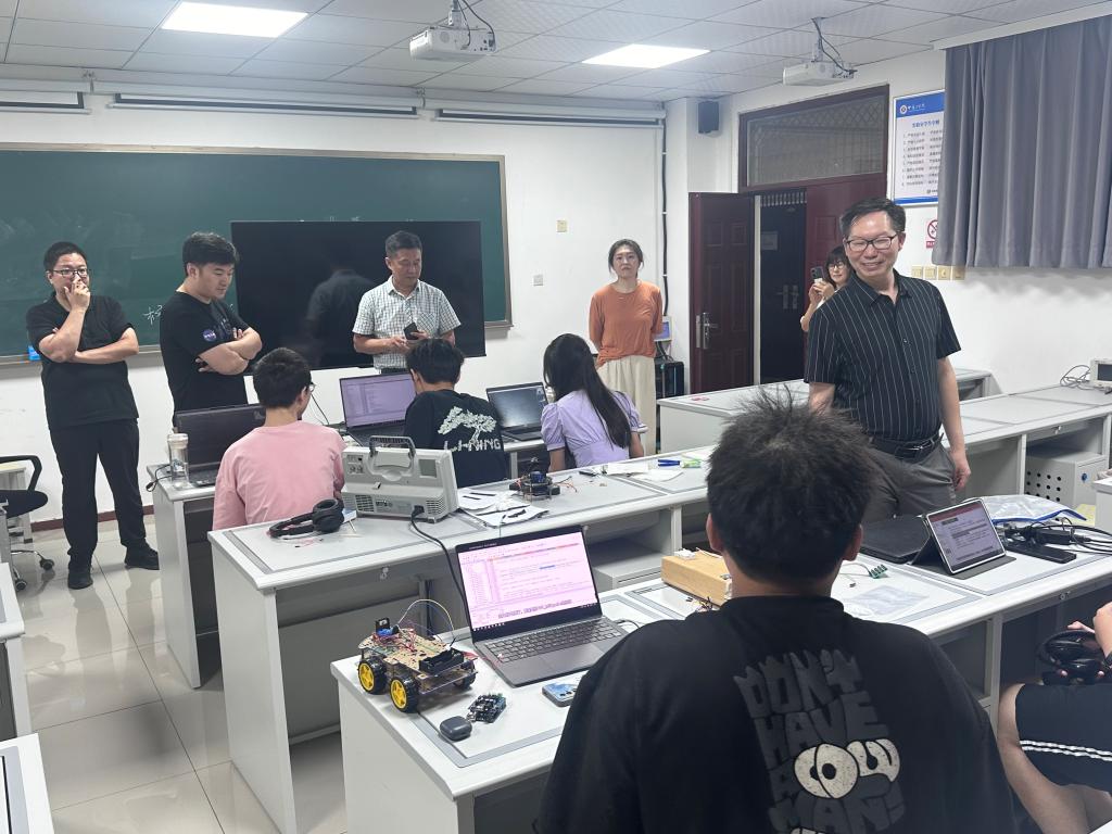 在实验室,老师们与同学们进行了亲切交流。党总支书记轩信飞对同学们的比赛准备进度进行细致探访,鼓励大家在即将到来的河南省电子设计大赛和全国总决赛中再创佳绩。执行院长温盛军希望大家珍惜夏季学期这一黄金时期,潜心钻研,勇于创新,争取更多科研成果,同时也叮嘱同学们要做到劳逸结合,合理规划时间。党总支副书记杨华表示学院将继续为同学们提供良好的学习和生活环境,助力实现科研目标和学术梦想。